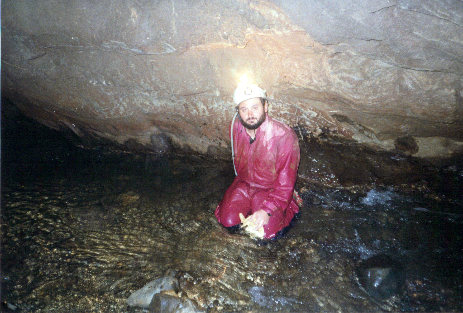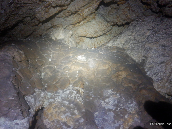 Questi depositi me li sono spiegati come un segno del lungo periodo di tempo in cui la grotta e’ rimasta sommersa dall’acqua. Il livello dell’acqua deve essere rimasto lo stesso per chissa’ quanto tempo, sicuramente abbastanza da far formare quelle sottili lastre di calcite che poi sono cadute giu’ quando la falda si e’ abbassata. Magari un giorno trovero’ un geologo a cui chiedere conferma, intanto ai miei amici la racconto cosi’.