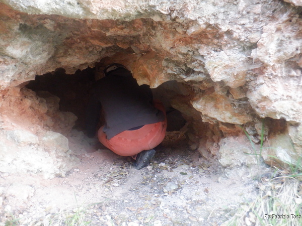 Con la guida di Martina che e’ veterana di questa grotta arriviamo in cima al colle e proseguiamo dalla parte opposta, sempre tenendoci vicini al bordo sassoso. Dopo qualche metro, sulla destra Martina mi indica un punto. “La grotta e’ la’”, mi dice. Sul momento vedo nulla, ma poi guardando attentamente individuo un buco, nemmeno tanto piccolo.