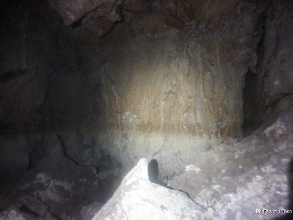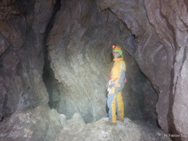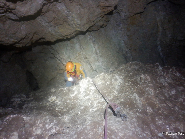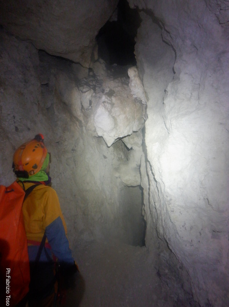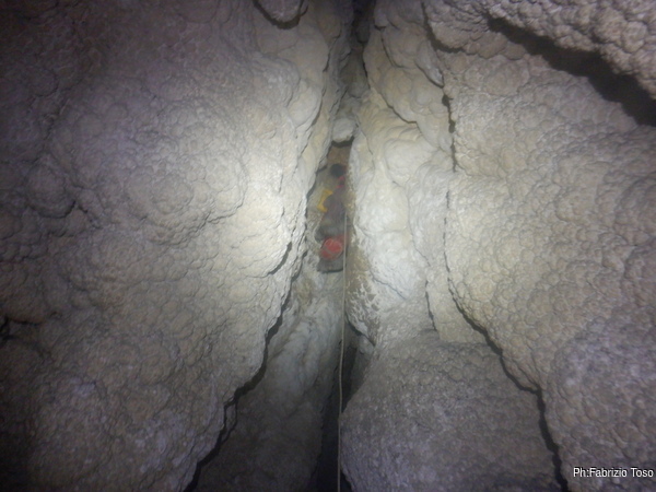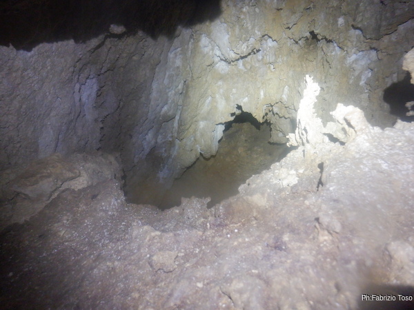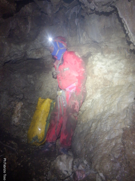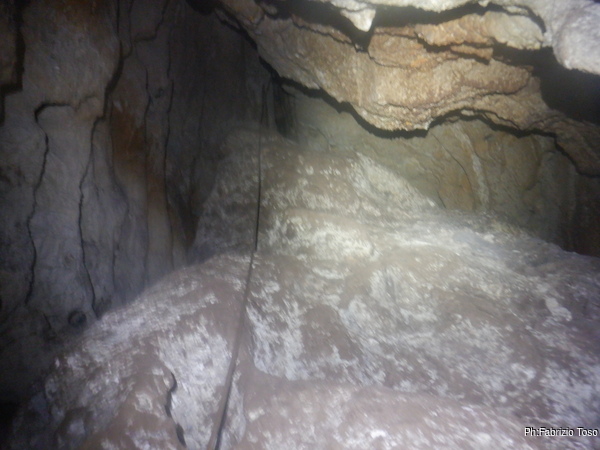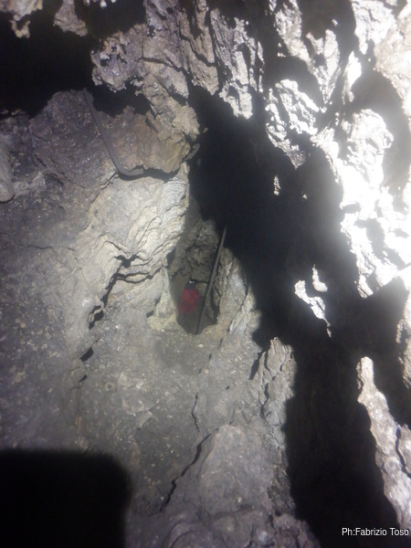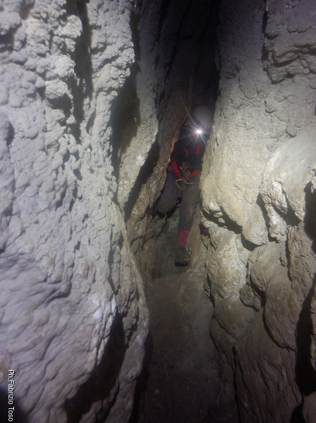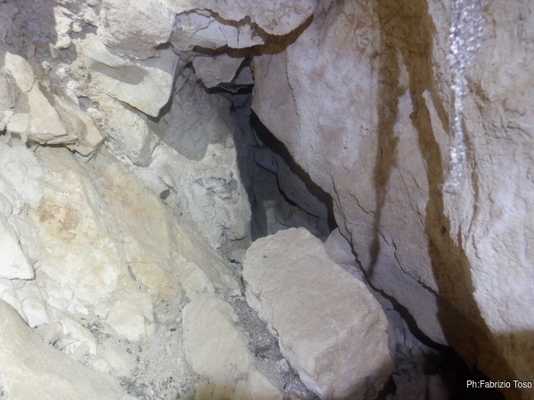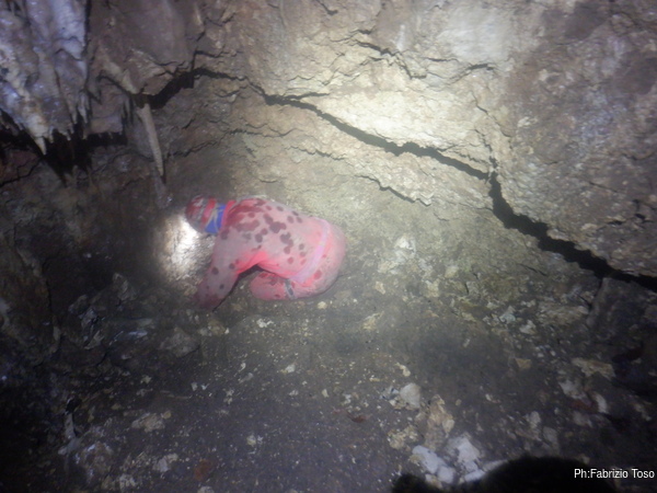 Lungo la galleria ci sono diversi cantieri aperti, sia verso il basso che verso l’alto. Purtroppo non e’ dato sapere chi ci ha lavorato ne’ se ci si sta lavorando ancora. Sono contrario a questa “omerta’ esplorativa” ma sembra essere un costume condiviso dalla maggior parte dei non molti speleo attivi nella regione.