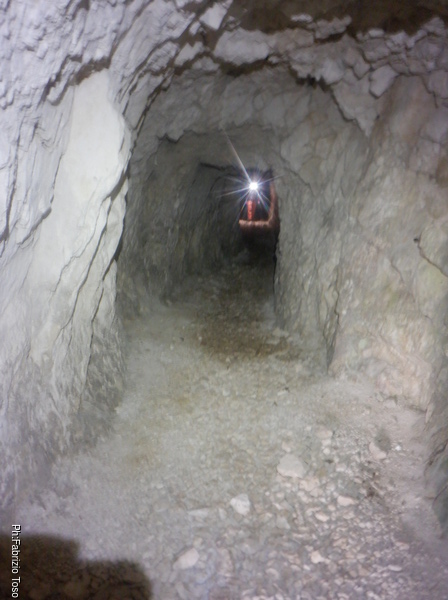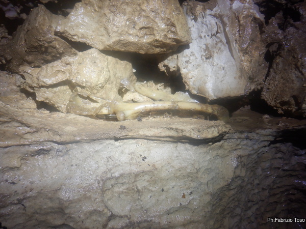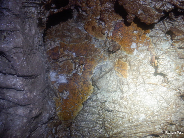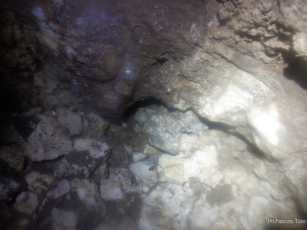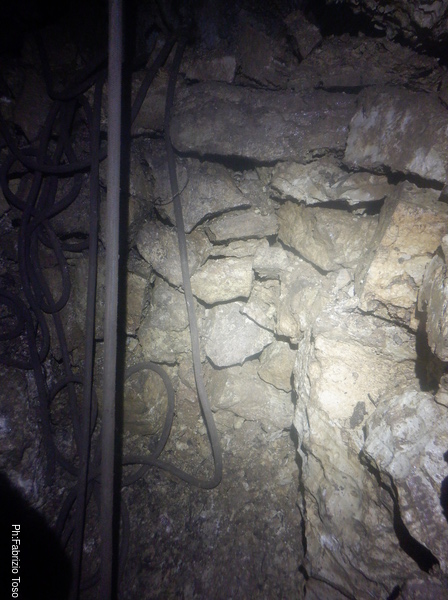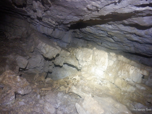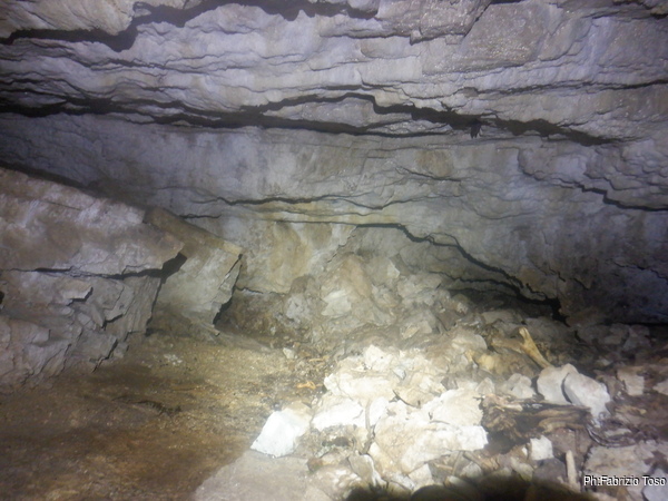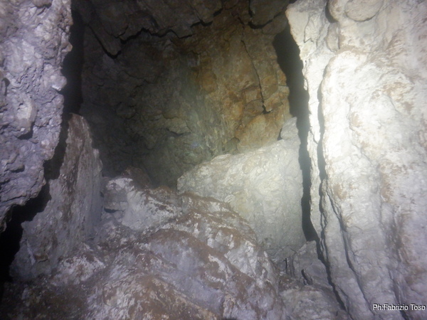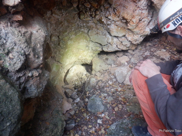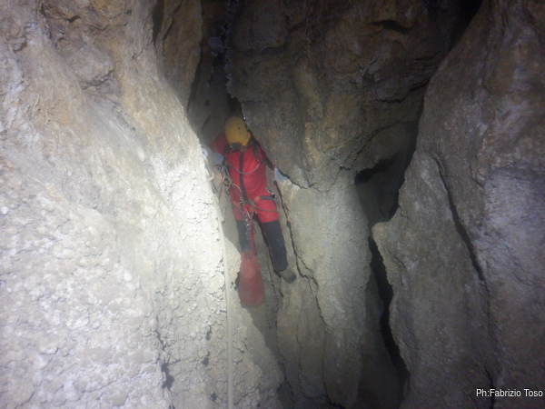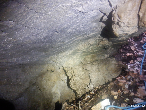 Lungo la galleria ci sono diversi cantieri aperti, sia verso il basso che verso l’alto. Purtroppo non e’ dato sapere chi ci ha lavorato ne’ se ci si sta lavorando ancora. Sono contrario a questa “omerta’ esplorativa” ma sembra essere un costume condiviso dalla maggior parte dei non molti speleo attivi nella regione.