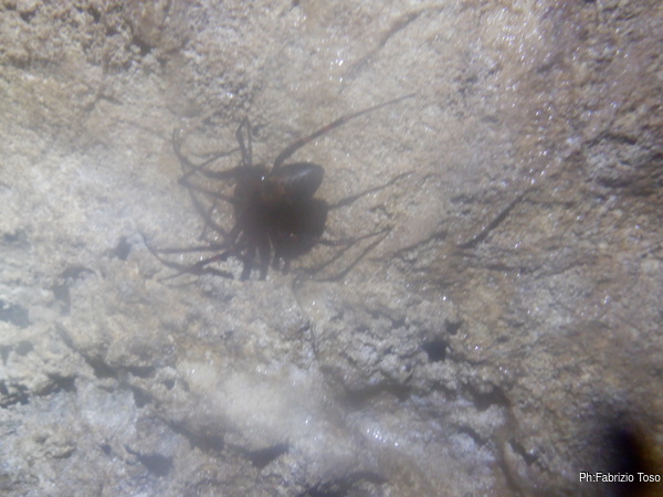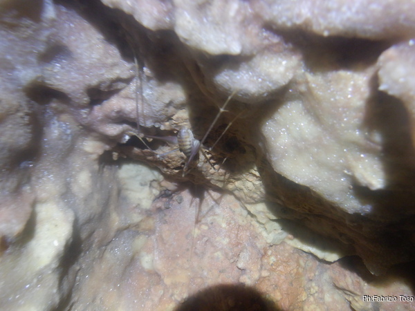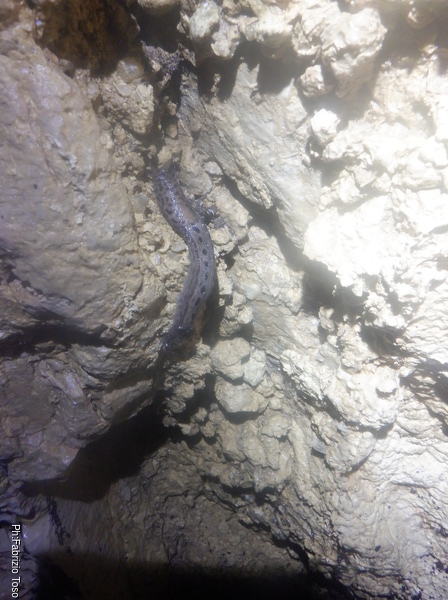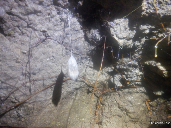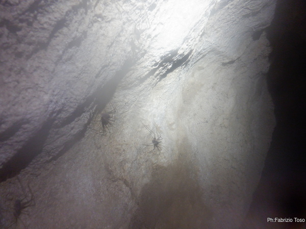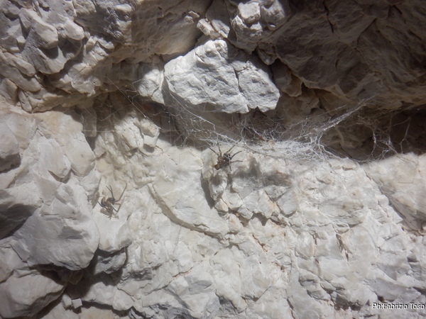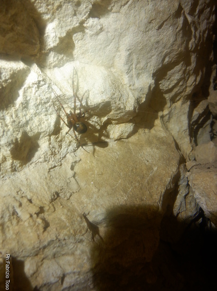 Girando trovo ben 4 pipistrelli che cerco di non disturbare troppo. Provo a fare una foto a uno di loro ma non ne viene granche’. La fauna della grotta e’ completata da almeno 3 ranocchiette grosse come l’ultima falange del mio dito indice che pero’ scompaiono tra i sassi appena le illumino. Vicino alla parete piu’ interna trovo anche un ragno con la sua tela. E’ bello grosso, mi viene da chiedere quanto sia ottimista a fare la sua tela in un posto del genere. Claudio nel frattempo e’ entrato e inizia a cercare le sue amate dolicopode…mi scordo di chiedergli se la sua ricerca ha successo perche’ vado con Luca in fondo alla sala dove troviamo uno stretto passaggio.