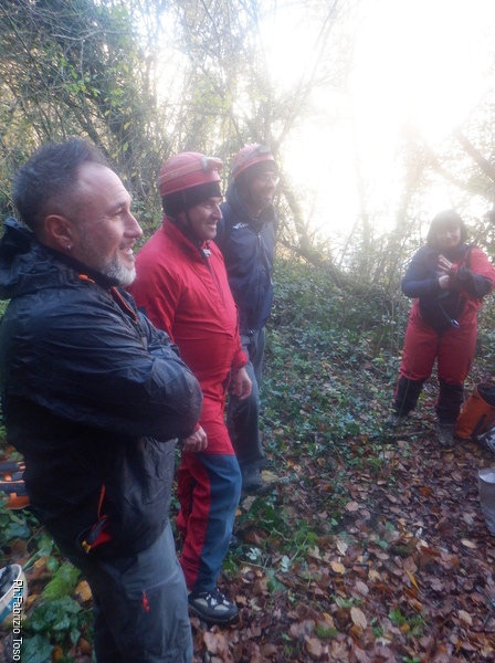 Finito lo spiegone i nostri amici sono pronti a iniziare la loro avventura speleologica. Nel frattempo Luca esce e ci racconta che e’ riuscito a passare la strettoia e dopo ci potrebbe essere qualcosa di interessante ma nascosto tra massi di crollo. Una forse bella notizia su cui si potra’ lavorare.