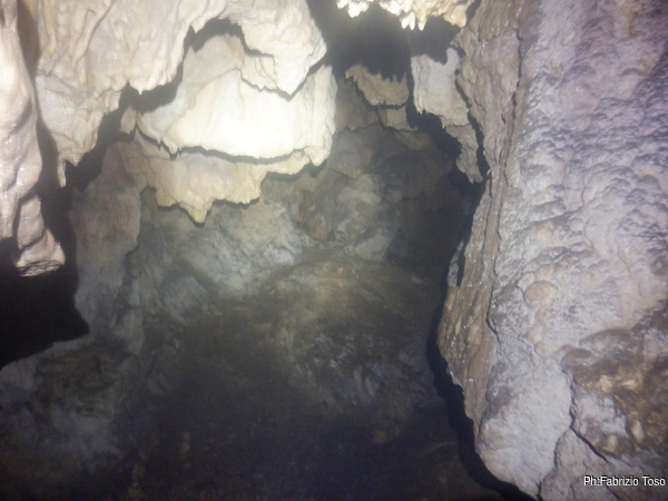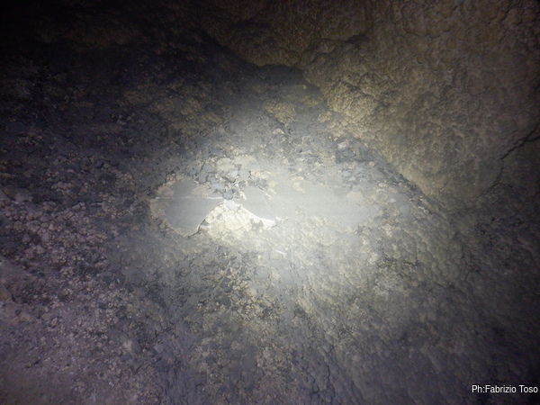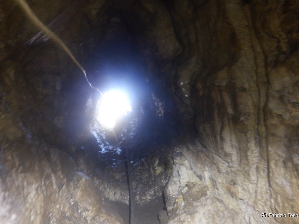 La grotta, dopo un primo tratto verticale di un paio di metri diventa un pozzo inclinato molto scivoloso perche’ alla base e’ praticamente tutto fango. Dopo 5 metri, o forse 4, di discesa in equilibrio precario mi devo accucciare perche’ il soffitto si abbassa bruscamente per poi rialzarsi subito dopo. Un altro paio di metri in verticale, sempre su fango concludono la discesa.