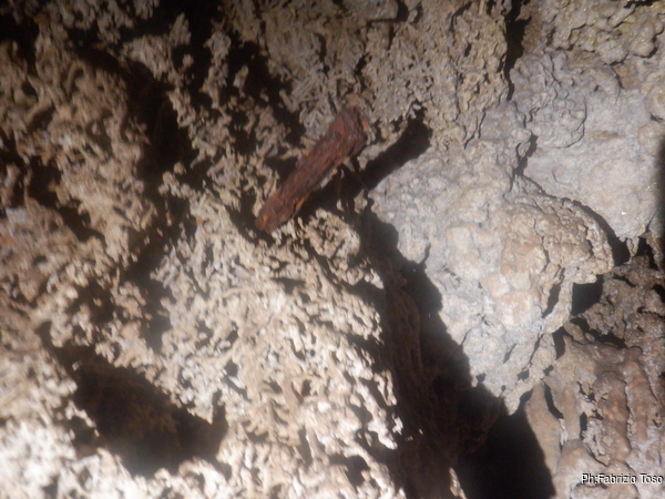 Dopo il saltino c’e’ il meandro alto per circa trenta metri. Dopo qualche metro mi fermo un attimo per tentare di prendere una foto di un pipistrello ma, sembra, senza riuscirci.