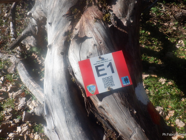 Per ora siamo ancora sul sentiero, come testimonia questo cartellino fissato a un tronco.