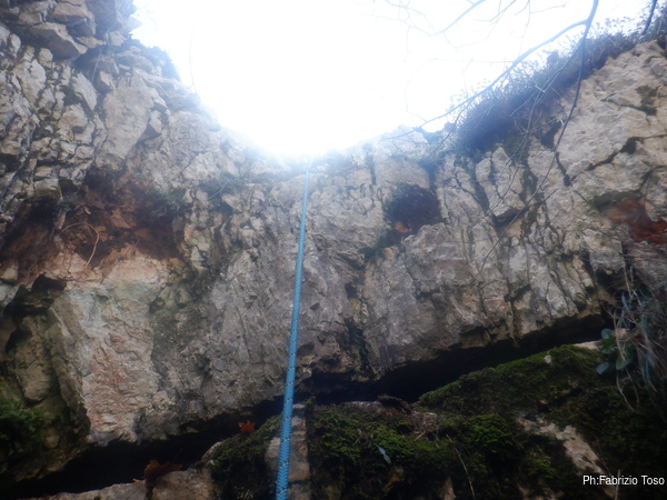 Scendo per primo. Evito di mettere un frazionamento finale e avverto i miei amici di tenersi scostati dalla parete con le gambe per evitare che la corda strusci sulla roccia.