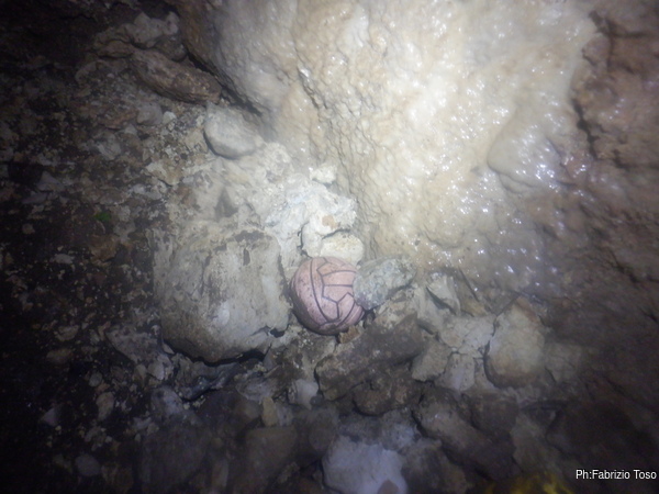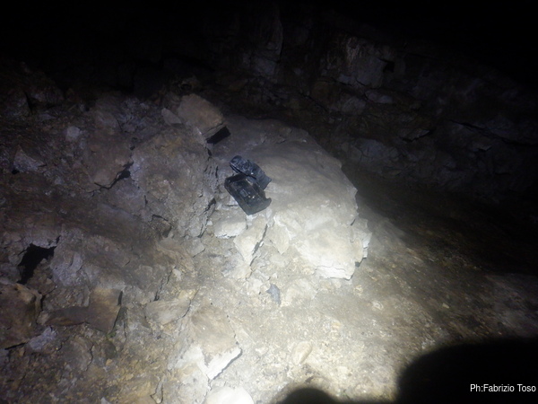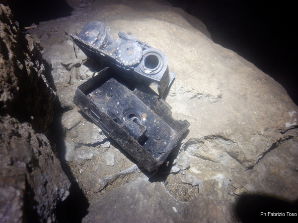 Alla base del pozzo d’ingresso trovo uno scivolo di terra che mi porta dentro la grotta. Come i miei amici avevano anticipato ora mi trovo nella sala principale e sono sul cocuzzolo di un cumulo di sassi che digradano davanti a me e alle mie spalle. Ma quello che attira per primo la mia attenzione sono i resti di una macchinetta fotografica. Sembra una di quelle usa e getta. Chissa’ da quanto e’ qua dentro.