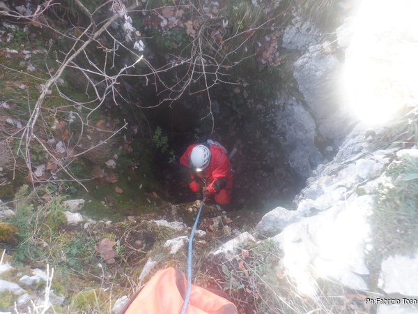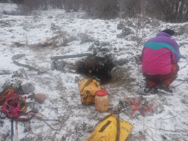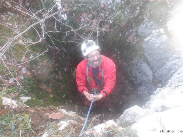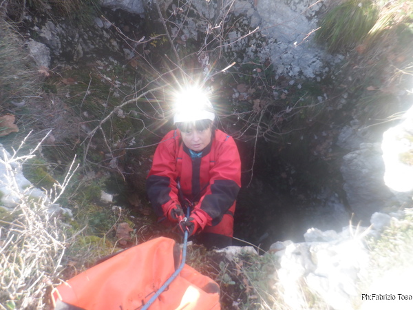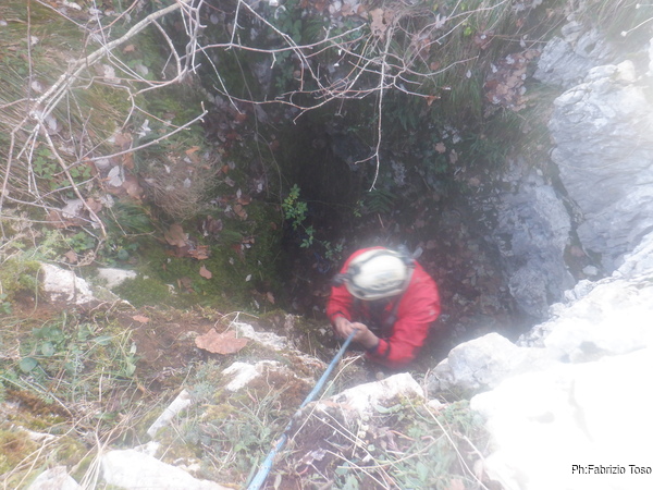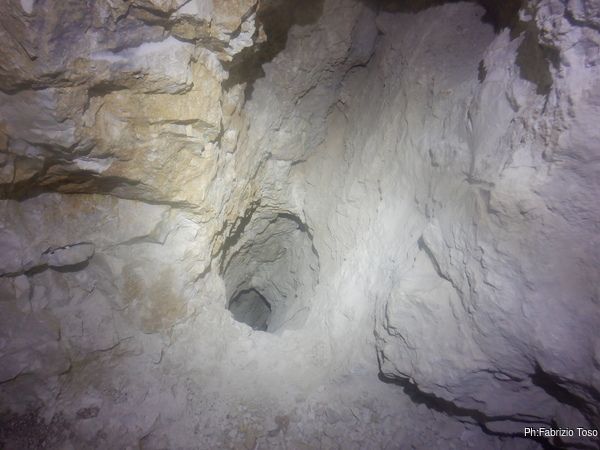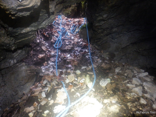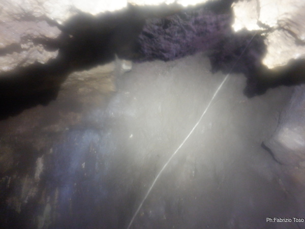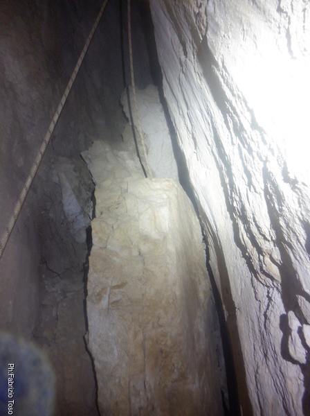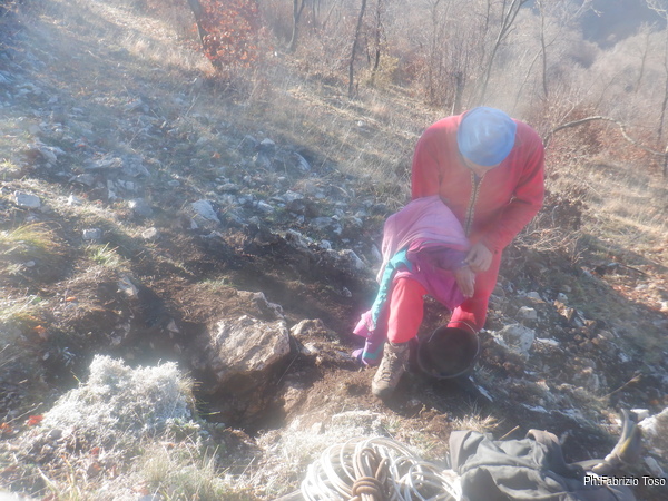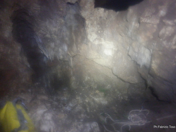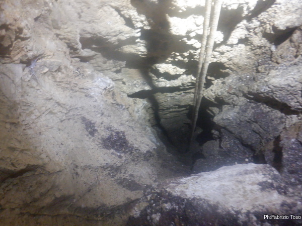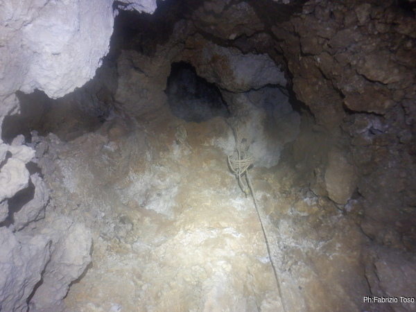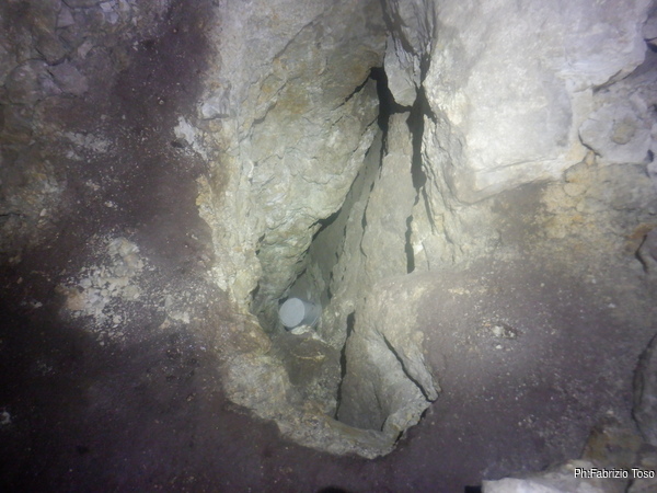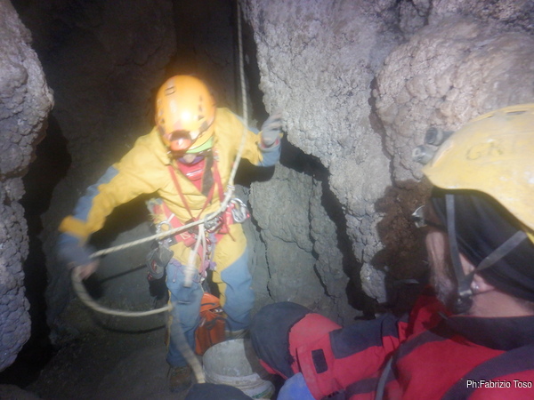 Dentro la grotta ci sono Nerone e Luca che stanno lavorando alacremente nel secondo pozzo. Visto che uno dei lavori da fare era togliere terra e sassi dal pozzo d’ingresso, mi metto d’accordo con Martina e Gabriele per farlo. Scendo il pozzo e quando sono alla base mi sistemo. Saluto Nerone, che e’ nella saletta aldila’ del passaggio basso e assiste Luca che lavora sul fondo del secondo pozzo.