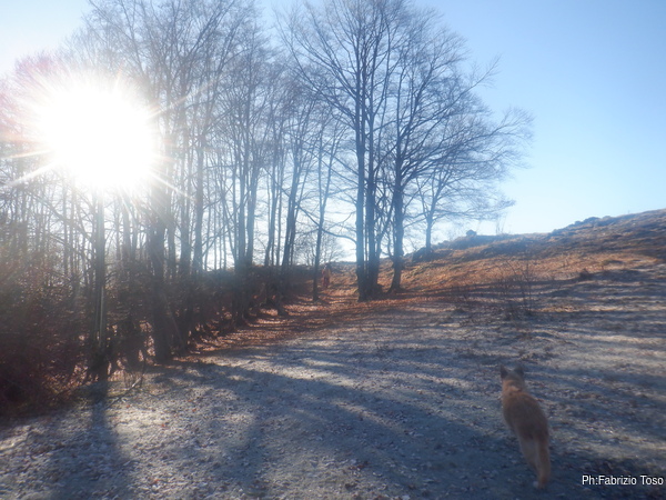 La giornata pare bella ma fa freddo e c’e’ un bel vento gelido a tenerci compagnia mentre ci cambiamo. Io mi allontano per cercare un posto sgombro dalla neve. Mi cambio prima che posso, Nerone e’ piu’ veloce e dopo un poco lo vedo fare capolino per vedere cosa sto combinando.