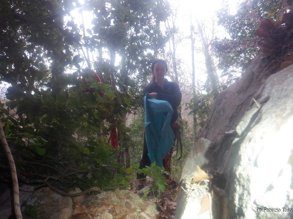 Mentre indosso l’attrezzatura chiedo a Martina di iniziare l’armo legando la corda all’albero piu’ vicino. Quando sono pronto mi unisco a darle una mano e in breve la corda e’ pronta per la discesa.