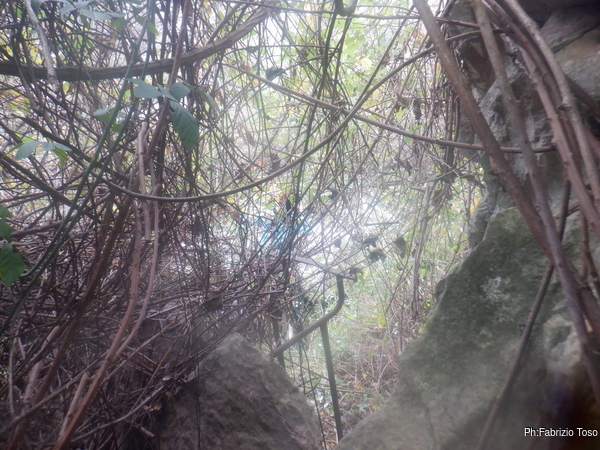 Si parte per la grotta. Non sono sicurissimo di ritrovare la strada per arrivare alla grotta. Prendo per il sentiero che conoscevo ma questo risulta chiuso da un muro inestricabile di rovi. Torniamo indietro e vago per un poco tra le fresche frasche cercando un pertugio da cui arrivare all’ingresso della grotta. Quando gia’ i miei amici iniziano a dubitare finalmente trovo un punto che sembra andare nella direzione giusta e mi addentro seguito con fiducia dai miei amici. Lo sguardo serio di Diana dimostra che non pensa sia la strada giusta, anche vedendo la profusione di rifiuti vari verso cui mi sto dirigendo.