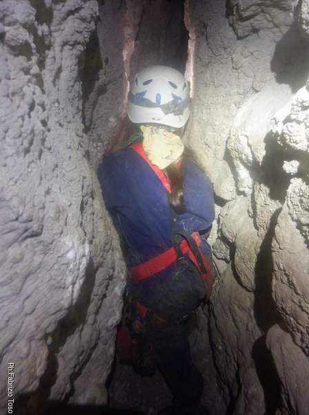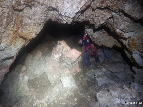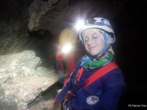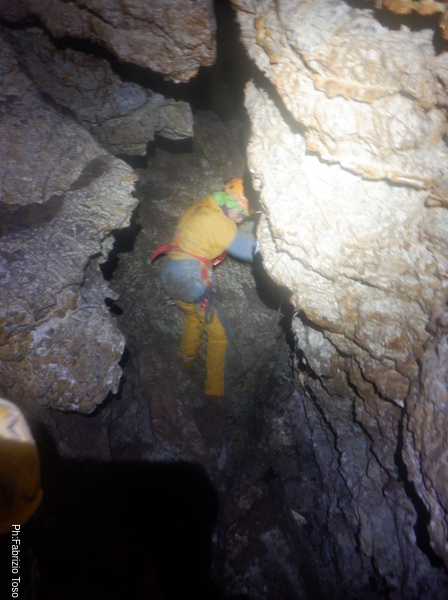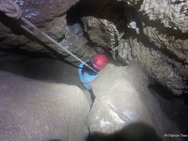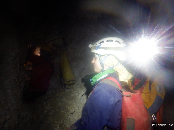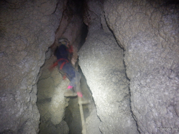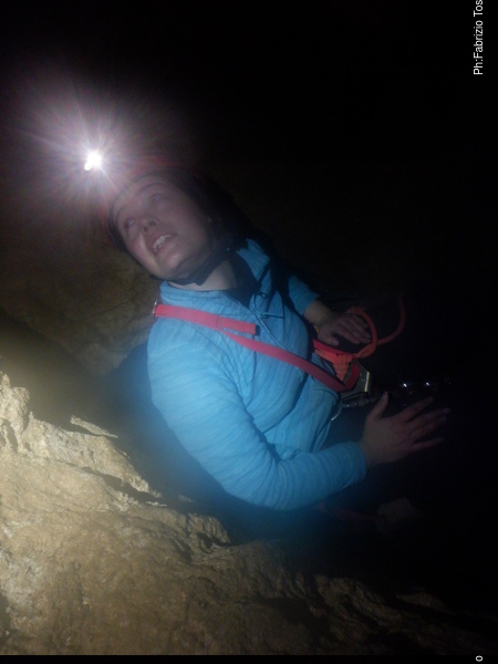 Il passaggio e’ ben stretto, ma forse passando in alto e con un poco di pazienza Luca puo’ farcela. Lo lascio mentre fa un tentativo, devo uscire a raggiungere Betta e magari dare una mano a Gabriele e Martina.