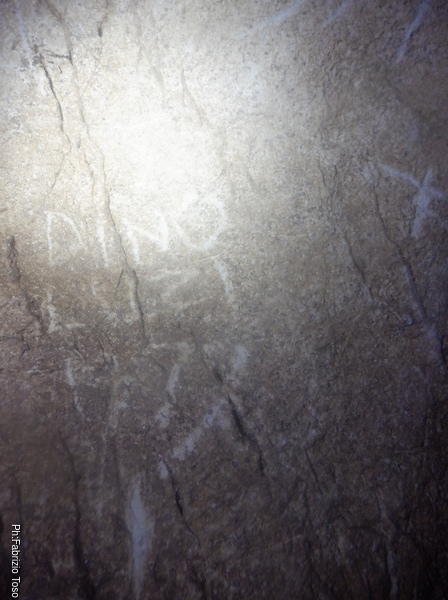Sono in una sala in discesa di 3×5 metri. Di lato trovo il simbolo del nostro gruppo dipinto sulla parete.