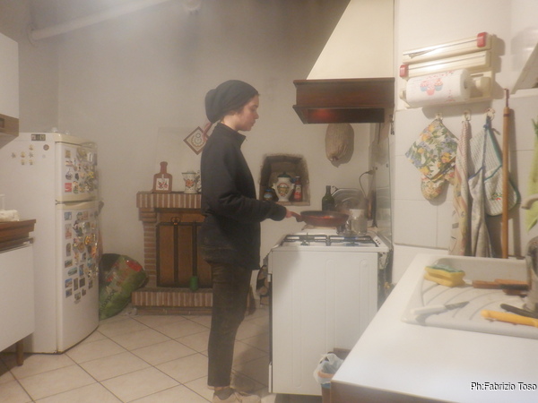 Iniziamo subito a prepararci, l’aria frizzante e’ stemperata dal sole. Diana si veste sotto l’occhio attento di Federico.
