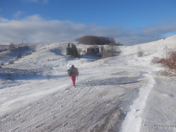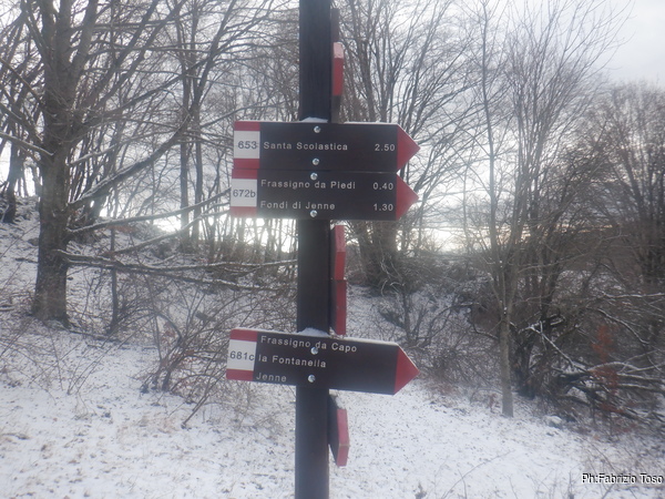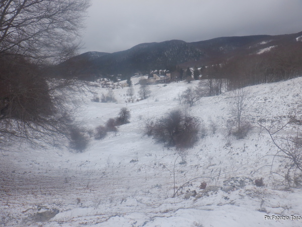 In una mezz’ora siamo a Livata, oggi parcheggiamo vicino alla chiesa perche’ Nerone ha timore di rimanere bloccato in caso di nevicata nel parcheggio solito. Fa nulla, si tratta solo di un duecento metri in piu’ di passeggiata.