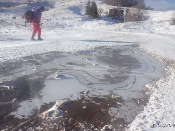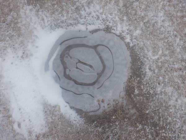 Nel tratto in piano ci sono numerose pozze d’acqua ghiacciate in cui il ghiaccio ha prodotto dei bei disegni.