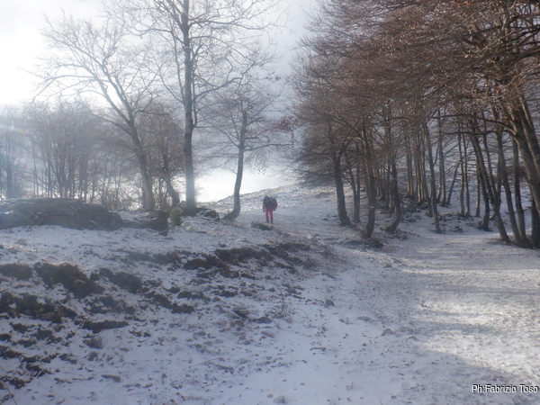Prima di affrontare la salita devo fare una sosta per un controllo nello zaino, mi e’ venuto il sospetto di aver dimenticato qualcosa. Sospetto infondato, pero’ poi devo correre un po’ per riacchiappare Nerone che nel frattempo ha proseguito.