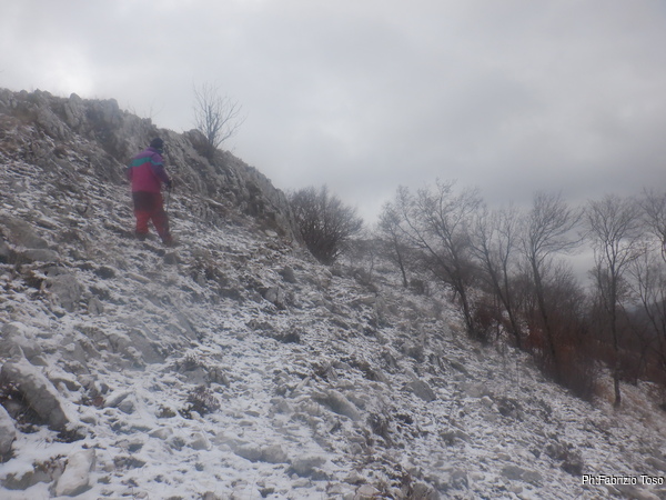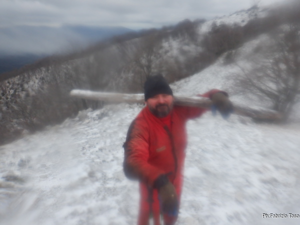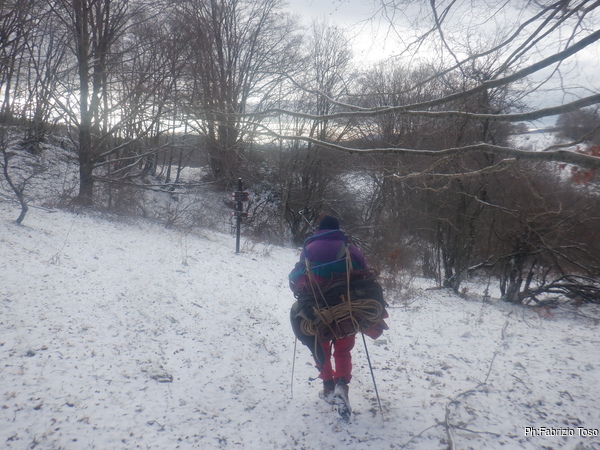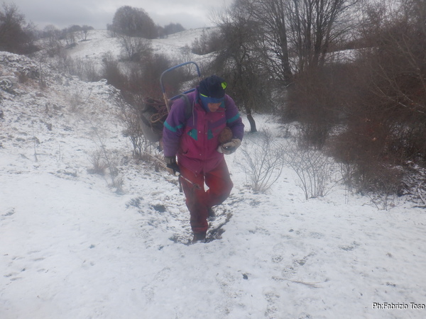 Risalgo e vado subito a togliere l’attrezzatura mentre Nerone disarma la corda. Il freddo intenso consiglia di ottimizzare i tempi per minimizzare i tempi. Quando esco vengo accolto da una sorpresa, ha iniziato a nevicare.