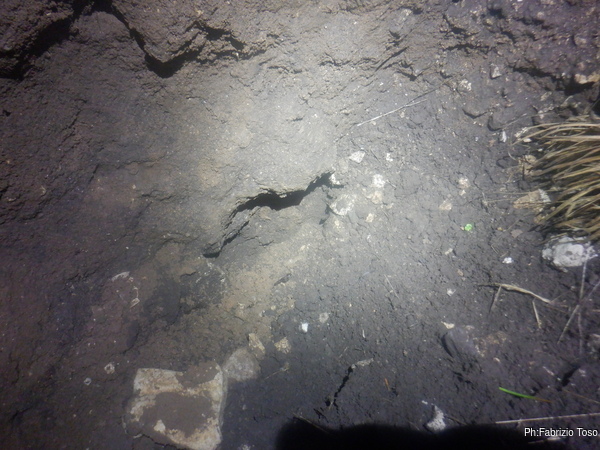 Una volta fuori, mentre Nerone “fa i ferri”, ovvero rimette a posto gli attrezzi, io sposto la corda e vado a dare uno sguardo al buco vicino. Prima di tentare la discesa ne allargo un poco l’ingresso, butto giu la corda e vado. Sotto trovo la saletta non catastabile, e’ formata da terra pronta al crolla e l’unica prosecuzione che individuo, e scavo brevemente, sembra essere contornata solo da terra. Unendo l’instabilita’ al fatto che sembra essere proprio sulla verticale della sala della nostra grotta mi convince a desistere.