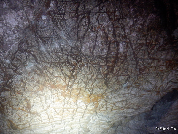 Siamo in quella che, a uso esclusivamente personale, ho battezzato “sala del trivio”. Mostro ai miei amici la colorazione delle pareti che evidenzia il passato livello dell’acqua.