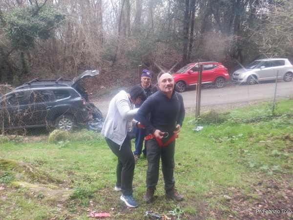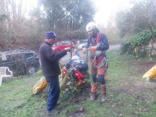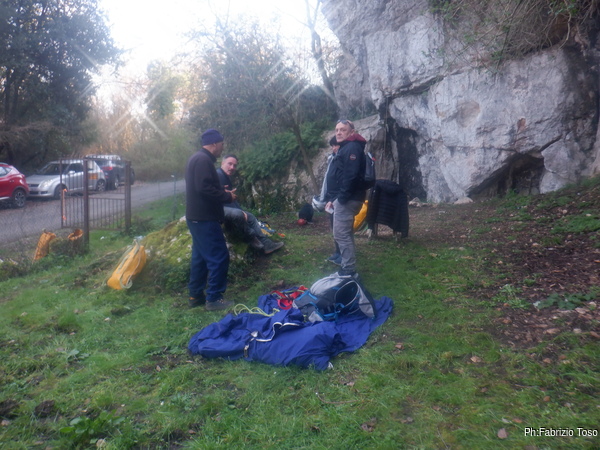 Presto arriva Martina con Alfonso e subito lo facciamo preparare per il cimento. Alfonso e’ uno dei 3 nuovi soci del gruppo e deve fare pratica con l’attrezzatura speleo poiche’ finora e’ andato solo in forra. Martina lo segue nella vestizione con la supervisione di Nerone.