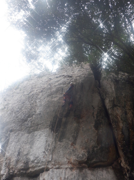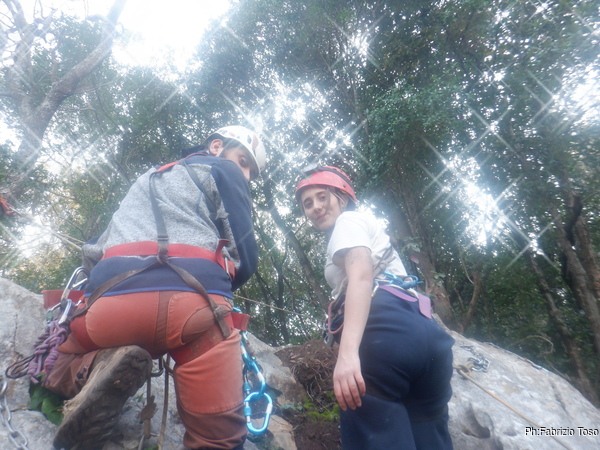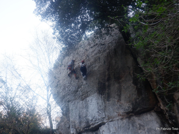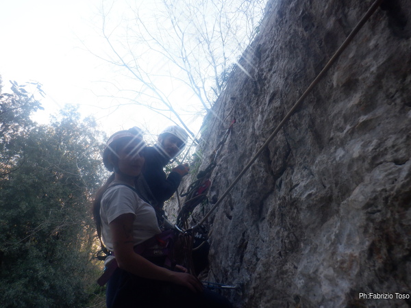 Per iniziare utilizziamo una via di pochi metri, tanto deve fare su e giu’ fino al primo frazionamento per impratichirsi con croll, maniglia, longe e discensore.