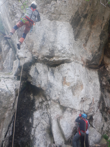Dopo 10 metri di discesa servirebbe un frazionamento ma non lo trovo. Provo a continuare la discesa e finalmente trovo un fix pero’ noto che e’ troppo in basso e 5 metri piu’ in alto la corda struscia malamente sulla parete. Risalgo con cautela e uso un cordino per armare un frazionamento su uno spuntone di roccia. Meglio. Inverto la direzione e scendo fino alla base del pozzo. Qua, spostandomi in piano nello stretto di un paio di metri potrei scendere ancora ma visto che il posto e’ anche ingombro di sassi decido di desistere. Mi limito a lanciare qualche sasso di sotto e valuto si tratti di un altro P10.