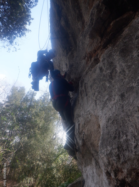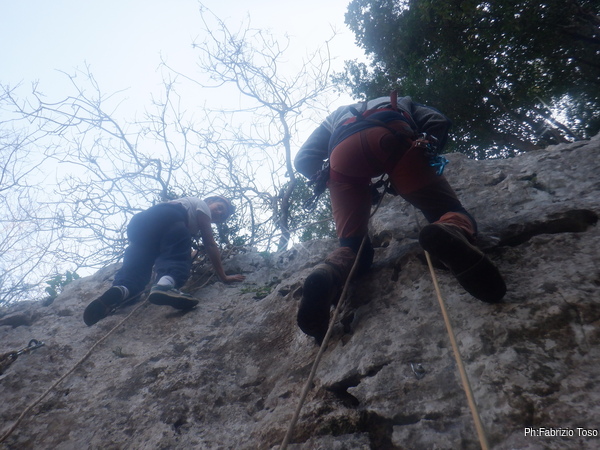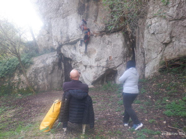 Quando Alfonso ha preso confidenza con l’attrezzatura Luca lo prende in consegna per iniziare il percorso su una via completa. Noi osserviamo da una distanza comoda.