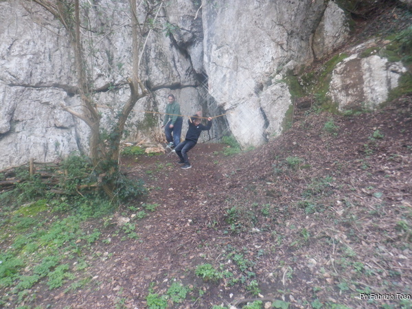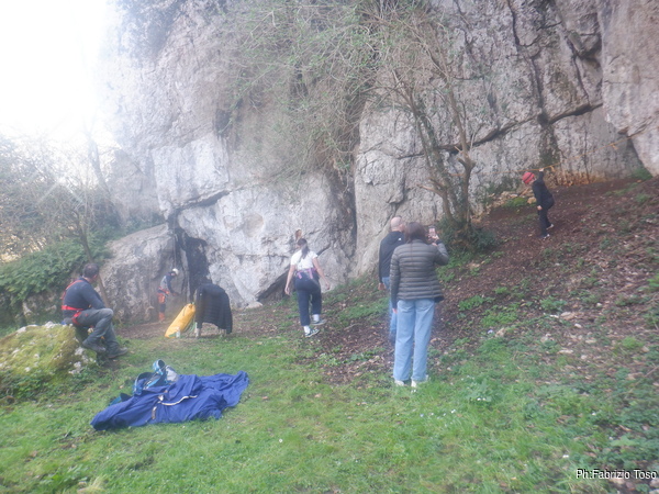 Al bordo iniziamo a procedere verso sinistra fino ad arrivare alla grotta. Nerone provvede a togliere i rami messi a protezione dell’ingresso.
