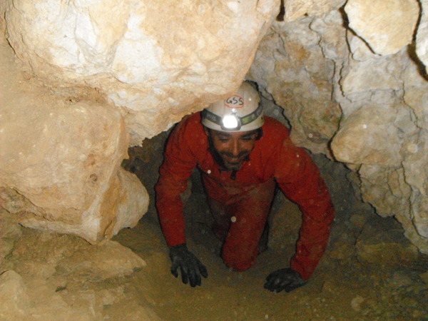 Arriviamo alla sala finale, finalmente si vede un po’ d’acqua, ma poca, sotto forma di fango. Ci deve essere anche una colonia di pipistrelli, la puzza di guano lo testimonia. Scendiamo al fondo, giu’ lungo la comoda condottina in discesa che chiude su frana. Stiamo per andarcene e continuare la visita altrove ma Gianluca dice di aver trovato una prosecuzione nella condotta. Si decide che Gianluca, Mattia ed io rimarremo a vedere la scoperta di Gianluca, gli altri andranno a continuare la visita.