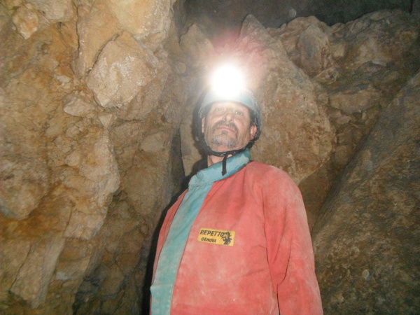 E’ un susseguirsi di piccole sale (comunque abbastanza grandi da accoglierci tutti) ed altrettante strettoie. La roccia e’ particolare, e’ una specie di conglomerato. Tullio ci dice che si tratta di rocce frantumate dallo scorrimento dei piani di faglia. Sicuramente nell’insieme e’ tutto ben stabile ma aggirarsi tra massi di crollo e vedere sul soffitto tutte quelle rocce pseudo-pericolanti da un po’ da pensare!