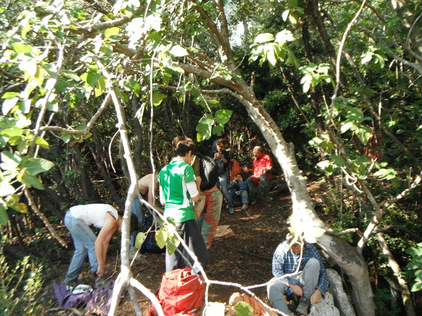Saliamo, saliamo, saliamo! Ci fermiamo in un punto in piano ad aspettare chi e’ rimasto indietro. Giuseppe ci dice che la grotta e’ diritta verso l’alto ma il sentiero prende a sinistra. Seguiamo il sentiero. Dopo un centinaio di metri il sentiero ci abbandona in un intrico di rovi, i celeberrimi “stracciabraghe”, con stupore scopro che anche loro hanno qualcosa di buono, incredibilmente hanno dei fiori molto profumati!