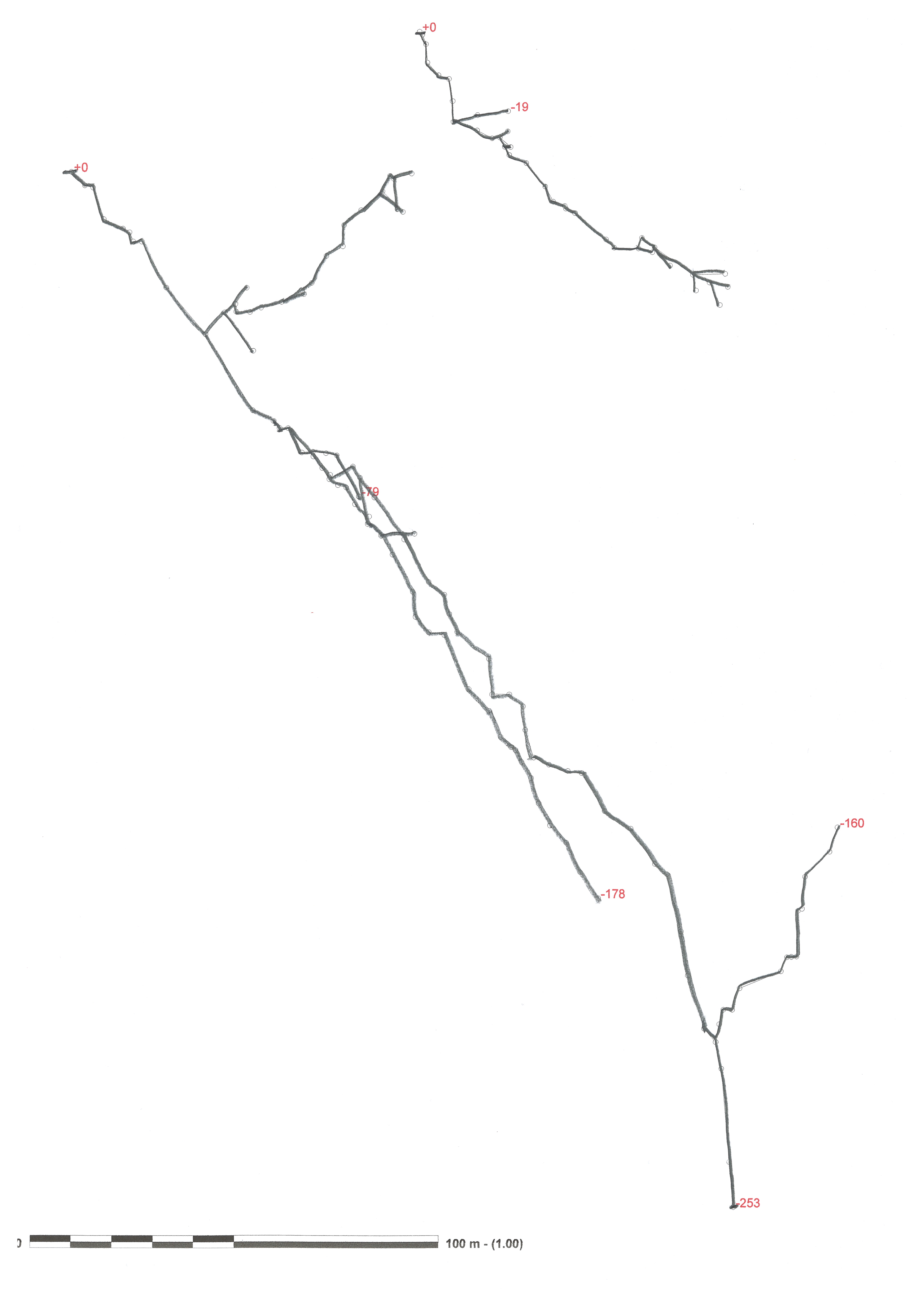 Per ultima lascio la sezione come semplice poligonale che pero’ ha pregi e difetti. E’ piu’ aggiornata dei precedenti disegni perche’ contiene anche la risalita di circa 50 metri fatta da Paolo nel 2012, non contiene le correzioni dei precedenti disegni per congiungere il ramo della cistifellea e il ramo dei russi. Eccola in tutta la sua semplicita’: