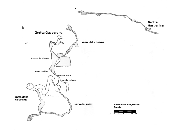 2° semestre 2010: A Gasperone viene finalmente passata la strettoia pirica. La grotta si divide in 2 rami, quello che sara’ il ramo della cistifellea ed il ramo dei russi. In una uscita gremita andiamo ad esplorarli. Vista l’abbondanza di partecipanti ci dividiamo in 2 squadre. In una ci sono Luigi e Natalino, dal loro cognome prendera’ il nome il ramo dei russi! L’altro ramo, per il momento senza nome lo esploriamo (credo!), Paolo, Clarice ed io fino ad esaurimento corde. Si susseguono le uscite, senza un aiuto non credo riusciro’ mai a ricordarne i particolari. Quasi sicuramente in questo periodo vengono fatte molte uscite per fare il rilievo della grotta. In ognuna di esse credo di poter dire che vi fosse almeno uno dei seguenti amici: Paolo, Clarice, Daniele, Gianni ed io. Viene raggiunto il fondo temporaneo della grotta a -253 metri e si decide di dedicarsi alla esplorazione minuziosa di possibili prosecuzioni laterali piu’ in alto. Gasperina viene esplorata ma si decide di non infierire oltre per non rovinarla troppo. Un giorno probabilmente si tornera’ anche la’.