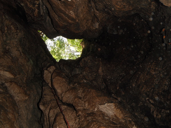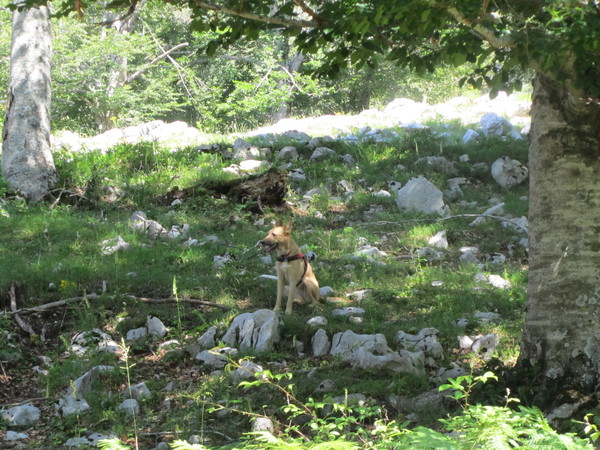 Ci inerpichiamo fino al parcheggio con la fonte, oramai sono quasi le 10.00, c’e’ un bel sole ma ancora non e’ asfissiante. Ci prepariamo, Gianni, Fabio e Roberto partono per primi perche’ faranno un’altra strada a rivedere delle grotte. Netta, Luisa e Cecilia, ovvero il trio NeLuCe, partono anche loro per il sentiero. Come al solito sono l’ultimo. Quando chiudo la macchina sono rimaste ad aspettarmi solo Maria, Betti e Luna. Zaino in spalla e via. Il sentiero e’ il solito, quello che va verso destra per portarci a sinistra! Passiamo il primo albero fermandoci all’ombra a riprendere fiato. Passiamo il secondo ripetendo la sosta. Al terzo albero decido che e’ il momento di bere un sorso d’acqua. Calo lo zaino, lo apro, prendo l’acqua e mi accorgo con sgomento che nello zaino manca il casco. Rivedo con la mente che il casco lo avevo appoggiato sul muretto vicino alla macchina con l’intenzione di prenderlo subito prima di chiudere lo zaino. E’ rimasto sul muretto! Avverto Betti e Maria, mollo tutto e corro giu’ pregando di trovarlo ancora. Luna tutta contenta del diversivo mi segue saltando di qua e di la’. Gli ultimi metri sono di angoscia pura, il muretto rimane non visibile dal sentiero fino all’ultimo. Ma eccolo, e’ ancora li’, che sollievo! Lo prendo, chiamo Luna che voleva fare conoscenza con una mucca, e ritorno indietro di buon passo. Recupero lo zaino e riprendiamo il cammino.