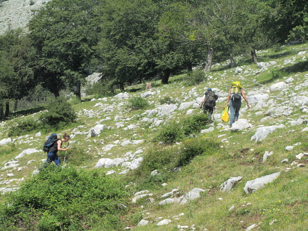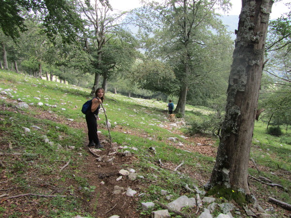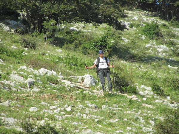 Arriviamo al “valico” e quindi al tratto in piano. La vegetazione e’ cresciuta a dismisura, passiamo di lato per evitarla. Usciamo dal boschetto e siamo sul lungo sentiero in leggera salita che ci portera’ alla grotta di monte Fato.
