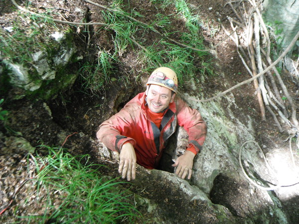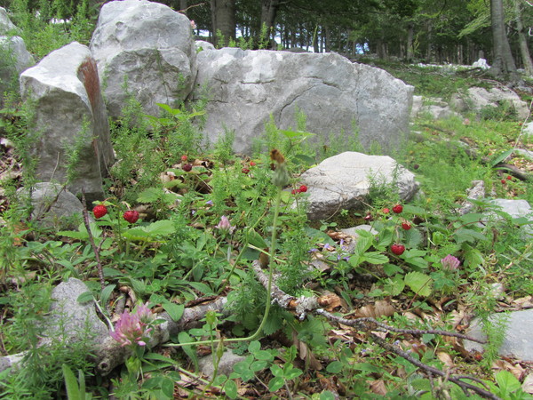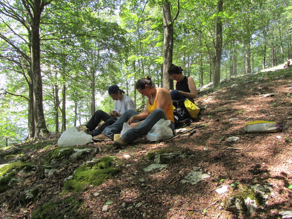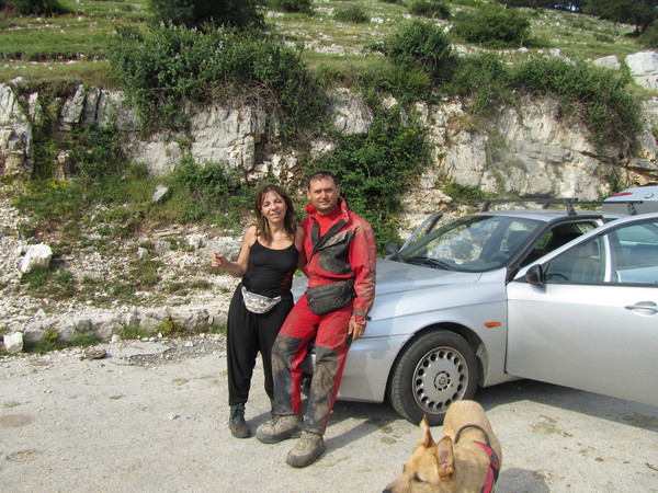 A stare fermi la temperatura non e’ caldissima, infatti Betti e Maria hanno indossato le giacche. Mentre aggrediamo i panini seriamente intenzionati a distruggerli, arriva il gruppo degli esploratori che si accomoda raccontandoci che tutte le grotte cercate sono state ritrovate con successo. Anzi, Gianni tornando vorrebbe fare una deviazione ad una di queste per scendere il pozzo iniziale di una ventina di metri. La proposta non viene bocciata ma nemmeno accolta con entusiasmo, vediamo cosa pensa di fare il Fatiglio, poi decidiamo! Dopo pranzo faccio ancora una breve sessione di lavoro nel bucaccio e poi esco a riposare approfittando per fare una passeggiata nei dintorni con Betti e Luna. Al ritorno dal giro chiedo a Gianni se vuole vedere la grotta dove stavano lavorando altri amici la volta scorsa. Mi risponde di si e quindi andiamo. Viene con noi anche Roberto, approfittiamo per una piccola ricognizione dei dintorni cercando di capire l’andamento delle fratture nel terreno seguendo l’allineamento delle doline che incontriamo.