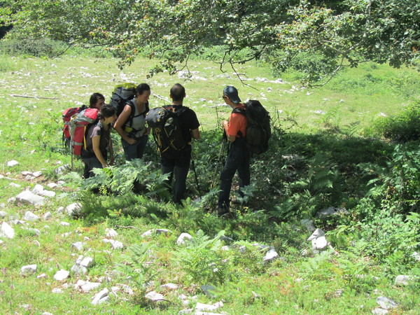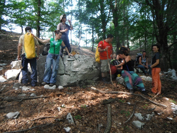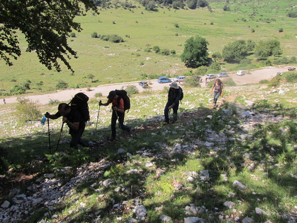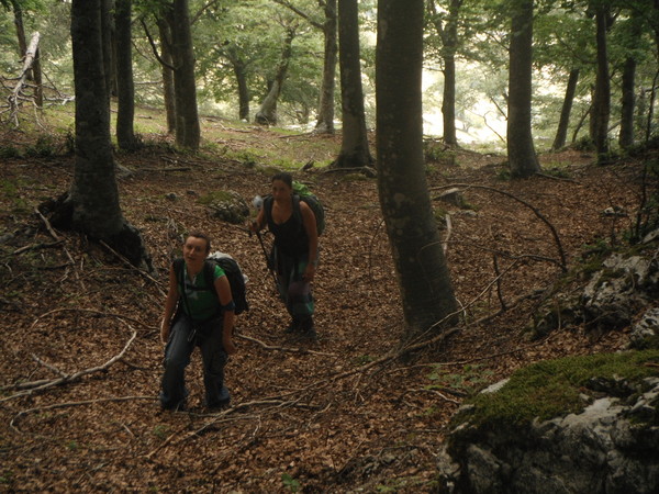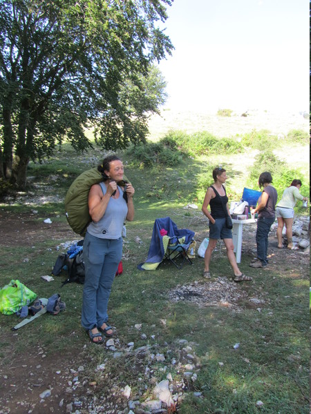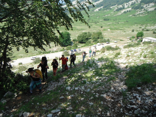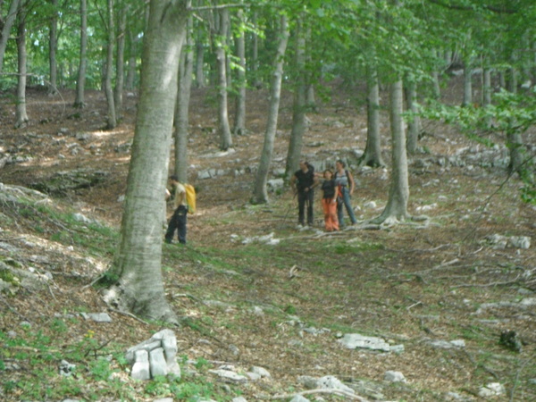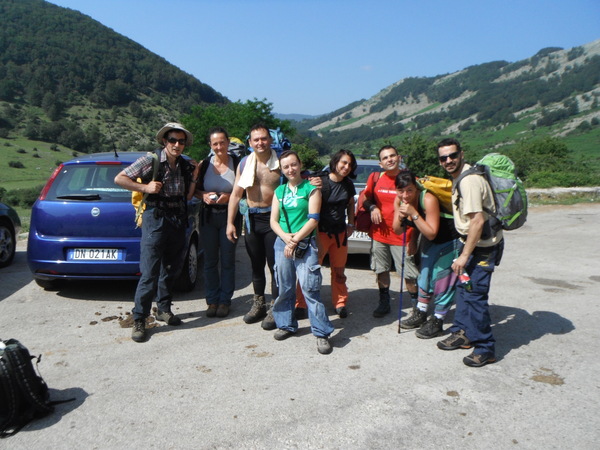 Non ho assistito all’epica battaglia pero’ mi raccontano che ella si rifiutava caparbiamente di farsi riporre nella propria custodia e solo con supremo sforzo congiunto di piu’ persone ed estrema violenza e’ stata ridotta a piu’ miti consigli. Saluto tutti gli amici che sono arrivati ieri dopo la mia partenza. Ci sono, Stefano con la dolce meta’, Rosa, che si accingono a tornare a Roma e Roberto che invece si aggreghera’ per la gita al Fatiglio. Cristina ci abbandona, approfitta di chi rientra per un passaggio. Mentre loro finisco di sistemare il campo mi vesto approfittando dell’ombra. Un rapido spostamento in massa al parcheggio del fontanile (se ho ben capito a Supino la chiamano Fonte Serena) e partiamo per l’arcinoto sentiero. Facendo le solite soste arriviamo in zona lavori.
