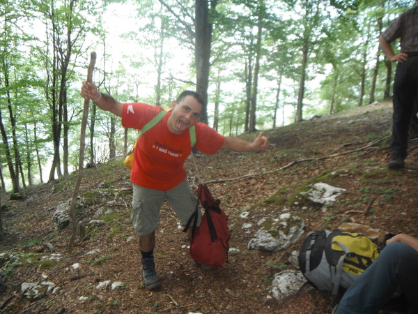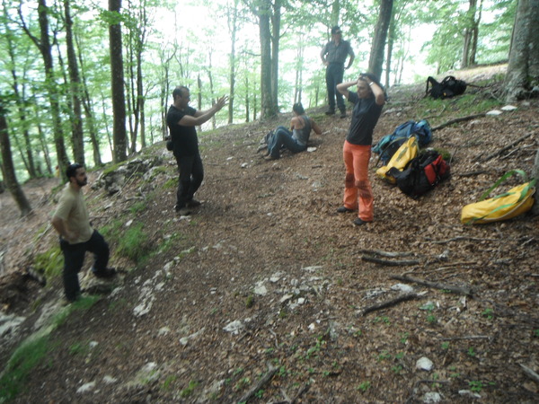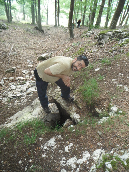 Verso le 15.00, quando mi fermo per pranzo sono finalmente riuscito a mettere un fix, attaccarci la corda (per chi la conosce, trattasi della fida Mhahrhthah Laccamuta!) e ficcarmi dentro al pertugio con le gambe. Ancora non si passa ma sembra veramente questione di poco. Per pranzo mangio gli avanti della “braciata” della sera prima. Inizio con una braciola e finisco con una fetta di bruschetta con salsiccia. Manca solo un bicchiere di vino! Il lavoro continua serrato. Ad una certa ora, non ricordo quando di preciso, mi accorgo di essere esausto. Mi accascio a terra e vi rimango per almeno un quarto d’ora in un dormiveglia vigile. Anche oggi alle 18.00 circa finisce la carica del trapano. Stefano e Fabio pero’ vogliono fare un ultimo tentativo. Netta sfodera allora il piccolo trapano da armo e glielo passa. Intanto mi tolgo la tuta, non ce la faccio proprio piu’ e poi a casa mi aspettano per cena! Il loro tentativo sembra aver avuto successo! Fabio ce ne porta anche la prova fotografica. Ci guardiamo in faccia, la tentazione e’ forte, ma e’ tardi e siamo tutti stanchi, anche se siamo attirati dalla possibilita’ di passare a vedere oltre decidiamo di rimandare alla prossima volta. Scendiamo lungo il sentiero dell’andata.