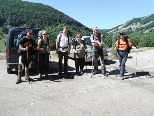 Nemmeno a dirlo l’appuntamento e’ alle 8.00 al bar “fico”. Vengo da Montebuono, quindi ho gia’ fatto un po’ di km, trovo ad aspettarmi Luisa, Barbara e Ferdinando. Nemmeno il tempo di qualche saluto che arrivano anche gli altri. Dopo la colazione ci compattiamo in 2 sole macchine. Barbara e Ferdinando hanno una mitica Lada con tanta capacita’ di carico ma solo 2 posti. Si prendono tutti gli zaini. Noi ci inzeppiamo, ma nemmeno tanto, nella capiente opel di Marco. Io sono accanto allo sportello di destra, mi devo ricordare di non aprirlo perche’ e’ difettoso e rimane bloccato! Durante il viaggio si parla del piu’ e del meno, ogni tanto provo a sonnecchiare, sono un po’ stanco. Saltiamo la sosta al casello di Ferentino e andiamo direttamente al bar pasticceria di Supino. Aspettando la Lada andiamo a fare spesa al supermercato. Riprendo la pizza rossa con salame. Siamo fuori dal bar quando arrivano i nostri. Anche loro vanno subito a fare provviste. Quando siamo riuniti e’ finalmente il momento bar. Mi limito ad un cappuccino, artisticamente decorato, come al solito. Ultimo tratto fino al parcheggio dove ci cambiamo.