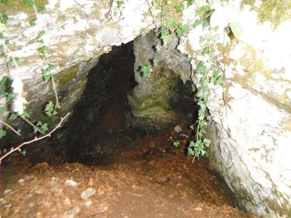 avanziamo ancora sul sentiero fino al punto un cui finiscono gli alberi. A quel punto tagliamo giu’ in diagonale verso la macchia di alberi sottostante. Alla sinistra abbiamo il canalone che porta fino al parcheggio, sulla destra c’e’ la grotta. C’e’ in verita’ tutta una serie di buchi di cui Gianni snocciola i nomi, tutti ispirati alla saga de “Il signore degli anelli”. Quello piu’ interessante si chiama “Tana dell’orchetto”.
