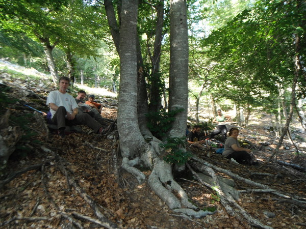 Un attimo di sosta per rifiatare e poi mi vesto per lei. Devo assolutamente andare a vedere se si passa la strettoia e cosa c’e’ dopo. Sistemo Mhahrhthah Laccamuta, fidata corda, nel caso si dovesse arrivare ad un baratro e poi mi infilo. Luisa mi segue e mi passa il materiale per fissare la corda al fix messo l’altra volta. Vado. Si, ci passo! Certo non e’ larghissimo, fatichero’ non poco ad uscirne, ma si passa! Cerco con i piedi gli spuntoni che ricordavo di aver sentito l’altra volta, ci batto sopra con decisione per assicurarmi che non siano posticci e scendo ancora un poco. Passo di sedere, passo il braccio destro, tasto in giro e trovo un appiglio. Bene, ancora qualche centimetro e riesco a far passare anche la testa. Son passato. C’e’ un pozzetto, tondo, e’ largo non piu’ di un metro, si puo’ scendere anche in libera. Saranno 6 metri scarsi poi sotto sembra interrompersi. Aspetto a sentirmi deluso, aggiorno brevemente Luisa che a sua volta riporta all’esterno e poi scendo. A meta’ del pozzetto mi sembra di sentire aria (dopo Barbara con la prova della sigaretta mi smentira’), di certo cala bruscamente la temperatura. Arrivo sul pavimento del pozzetto. Ho di fronte una nuova strettoia. Non e’ lunga, sara’ un metro circa. Il brutto e’ che dopo non si riesce ad intuire alcuna prosecuzione umanamente percorribile. Sempre aggiornando i miei amici col tramite di Luisa inizio a togliere un po’ dei sassi che avevamo tirato giu’ e che si sono ammucchiati vicino alla strettoia. Passo qualche minuto a tirare sassi il piu’ avanti possibile sperando di “sentir cantare” un altro pozzo ma nulla. Me ne esco. Il passaggio della strettoia in salita e’ impegnativo come avevo immaginato. Nel passarlo ansimo come una pentola a pressione, tanto che Luisa si preoccupa per la possibilita’ che io rimanga li’! Alla fine l’ho vinta io ed esco. Fuori parliamo di quanto ho visto. Io oggi mi sento stanco e non ho molta voglia di fare, pero’ Barbara e Ferdinando scoppiano d’energia e quindi decidiamo che andranno giu’, prima per finire di pulire dai sassi e poi per lavorare un po’ alla nuova strettoia. Noi resteremo fuori a fare supporto esterno, o meglio, Gianni e Marco vanno in perlustrazione a riprendere le coordinate GPS dell’ingresso di alcune grotte nei dintorni, Maria opta per un riposino, Luisa agisce da collegamento esterno, tira fuori il sacco pieno di sassi che gli passano da dentro, passa dentro i materiali da disostruzione e cosi’ via. Io mi stendo comodamente sul plaid che ha portato Barbara, preparo il materiale e poi imito Maria, chiudo beatamente gli occhi cullato dai rumori del lavoro dei miei solerti amici! Barbara per prima cosa fa la prova con la sigaretta. La sigarettaccia mi smentisce subito, di aria non ce n’e’! Mi rassegno all’evidenza di quella sigaretta puzzona e continuo la mia “meditazione”. Come presagivo il lavoro e’ non facile. Dopo essersi avvicendati dentro anche loro ne hanno abbastanza della strettoia. Riuniti di nuovo fuori facciamo pranzo. Faremo il rilievo, dopo tutto ora il Fatiglio e’ decisamente catastabile. Sembra che questo onore tocchi a me. Ne farei anche a meno, pero’ vabbe’, mi rimetto la tuta e parto. Anche questa volta Luisa, infaticabile, scende al primo pozzetto per darmi una mano e passarmi i materiali. Arrivo al nuovo fondo, butto giu’ ancora qualche sasso, mi accartoccio per avvicinare la faccia al buco, ma niente, non si capisce proprio se continua in qualche maniera. Con qualche imprecazione per la continua pioggia di terra che mi cade addosso, mi faccio passare la sacca da rilievo, magari con il laser si riesce a “vedere” oltre…Ce l’ho, lo accendo e provo qualche misura puntandolo in varie maniere. Il massimo che raggiungo e’ poco piu’ di 3 metri. Prendo anche direzione ed inclinazione e comunico il tutto a Luisa che a sua volta rigira i dati a Maria che prende nota. Che organizzazione! Risalgo fino alla strettoia, prendo i dati e li comunico. Passo di nuovo la strettoia sbuffando come un mantice e quindi prendo i dati dei 3 metri di grotta creata a mano con tanta fatica. Luisa esce, intanto io disarmo e poi gli passo tutti gli attrezzi che sono rimasti dentro. Esco, prendo l’ultimo punto, corredo i dati presi con alcune informazioni utili di cui Maria prende nota e poi mi concedo un bel sorso d’acqua. Rifacciamo i materiali, qualcuno libera la Mhahrhthah dall’abbraccio con l’albero e riponiamo il tutto negli zaini. Qualcuno, forse Ferdinando, generosamente si fa carico di portare anche la mia parte di materiale, non me ne lagno, anzi! Si parte.