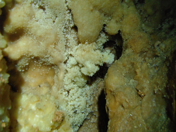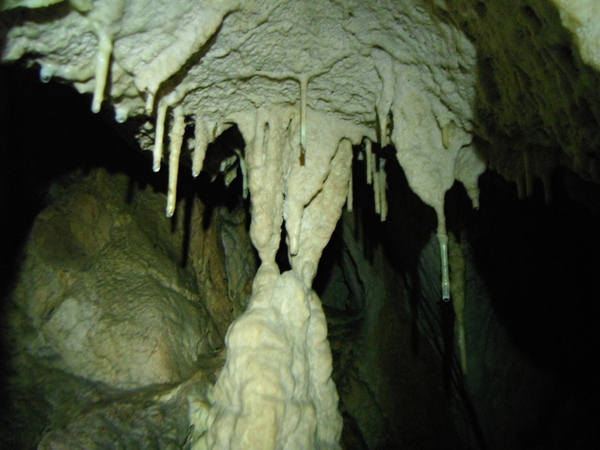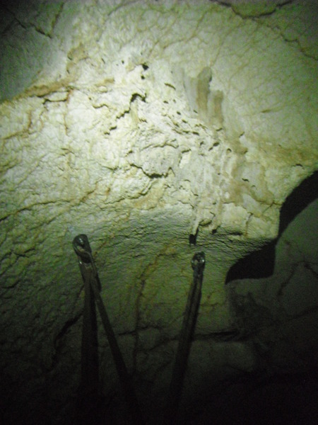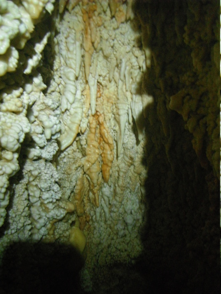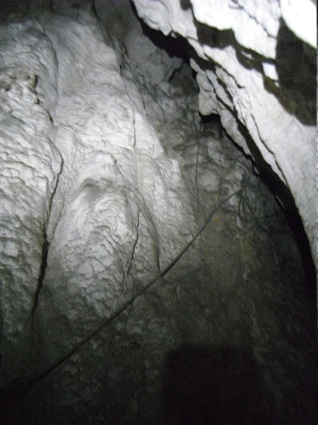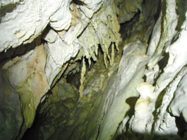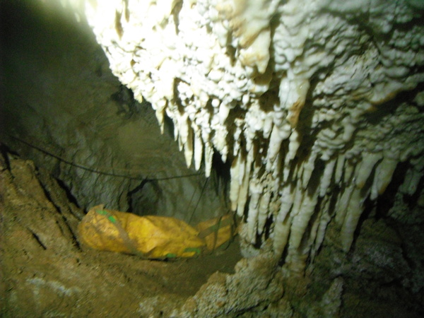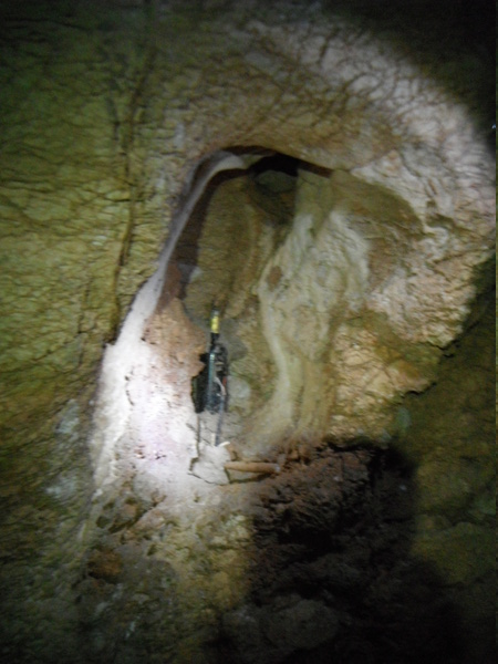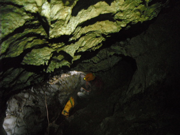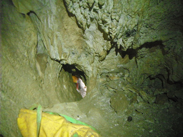 Approfitto per dare un occhio al piccolo ambiente dove la volta scorsa avevo trovato i zanzaroni. Ci confrontiamo un po’ sulla possibilita’ di una prosecuzione. Ho avuto la sensazione di sentire un poco d’aria ma Giulio non e’ di questo parere. Archivio la cosa per il momento, anche perche’ non e’ la giornata giusta per fare considerazioni sulla circolazione dell’aria, oggi, con il tempaccio che fa, la grotta e’ decisamente in stallo. Prima di ripartire mi conforto con un po’ di cioccolata e poi ripartiamo.