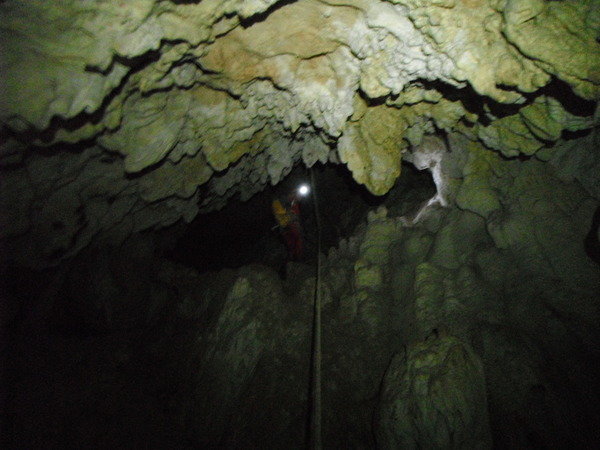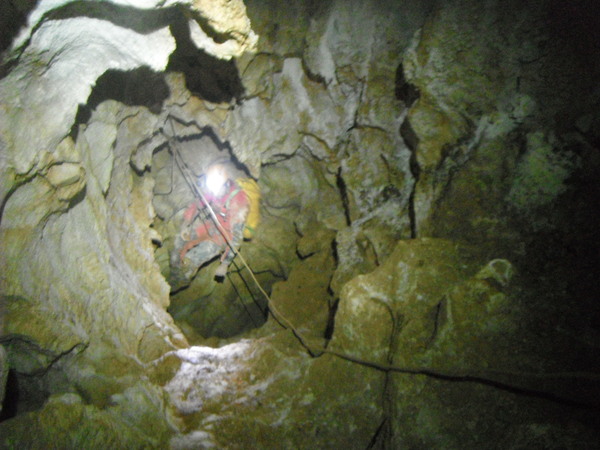 Mi metto comodo e urlo la libera a Giulio. Con qualche imprecazione arriva pure lui. Spendo qualche parola per illustrare il posto in cui siamo e poi scendo la seconda parte del pozzo.