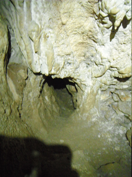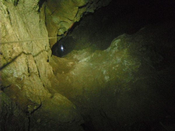 Pochi metri e siamo alla giunzione tra il ramo dei russi ed il ramo della cistifellea. La suddetta giunzione e’ proprio a pochi metri dall’inizio del pozzo che porta al fondo, da quel punto in poi praticamente la grotta si puo’ considerare una unica verticale. Per questa volta il fondo lo lasciamo riposare. Risaliamo a chiudere il nostro giro. Ci fermiamo a fare sosta sulla piccola piazzola all’inizio del pozzo.