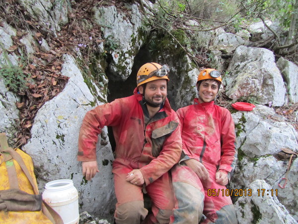Rinunciamo. Mentre Giulio riprende fiato risalgo il primo tratto di pozzo. Lo aspetto e poi proseguo. Alla ex-strettoia grido la libera. Mentre attendo, sento Giulio risalire imprecando perche’ la corda non scorre nel croll. Eccolo che fa capolino. Vado avanti per fargli posto e proseguo verso l’uscita. Risalendo il pozzetto vedo che fuori c’e’ ancora luce, benone, deve aver rinfrescato perche’ ora c’e’ un po’ di circolazione d’aria. Aspetto Giulio nella saletta iniziale. Una volta insieme recuperiamo le nostre cose ed usciamo. Visto che non piove approfittiamo per fare un paio di foto. Le facciamo con le macchinette “buone” che abbiamo portato, o meglio, che ha portato Giulio nel suo zaino, con tanto di flash e di cavalletto. Tanta fatica per nulla, non le abbiamo utilizzate.