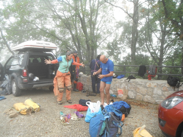 Sbrighiamo le incombenze; recupero della chiave della sbarra dai vigili, cappuccino, pizza e finalmente siamo pronti. Nuovamente inzeppati in macchina, saliamo. Allo spiazzo dell’eremo procediamo alla vestizione,