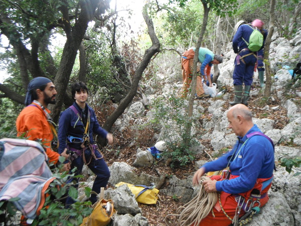 Ci prepariamo alla svelta. Contrariamente alla mia intenzione iniziale mi offro (o vengo offerto, non ricordo!) per l’armo. Frego la chiavetta d’armo a Nonno Giorgio, acchiappo quel che resta di Mhahrhthah Laccamuta (la fida corda che ci ha fatto tanta compagnia al Fatiglio). Dico quel che resta perche’ e’ gia’ stata tagliata in quanto lesionata. Purtroppo esaminandola scopriamo altre 2 lesioni. Per ora rimediamo con 2 nodi che isolano il danno ma poi al gruppo credo che bisognera’ darle “un taglio”, anzi piu’ di uno, povera Mhahrhthah! Si parte dall’albero e si fraziona all’inizio del pozzo iniziale. Il primo dei nodi che isolano le lesioni lo facciamo capitare li vicino cosi’ non da’ fastidio. Arrivo alla base e proseguo per lo scivolo. Il secondo nodo “isolante” capita proprio in corrispondenza dell’armo del secondo pozzo. Bene, cosi’ anche lui e’ sistemato e non portera’ fastidi durante la progressione. Mentre sistemo il secondo pozzetto vengo raggiunto da Flavia. I nostri “corsari” sono entrati in azione. E’ ufficialmente iniziata l’uscita, eccoli ancora freschi e riposati dopo il pozzetto iniziale