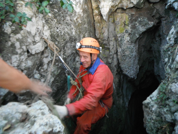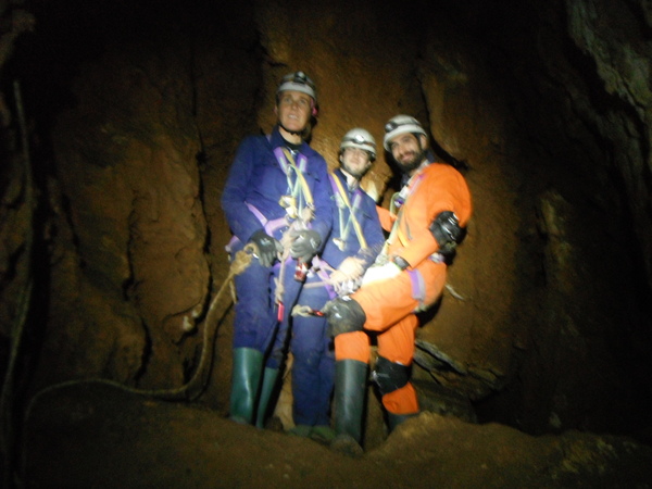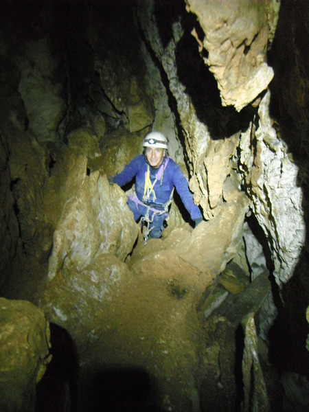 Pensavo di avere della cioccolata pero’ mi sbagliavo, Claudio gentilmente mi offre della pizza. Ne prendo poca, mi devo tenere leggero per cena! Durante la pausa decidiamo che possiamo terminare la discesa e prendere la via del ritorno. Risalgo e aspetto. Arriva Flavia, concordiamo che io andro’ avanti passando la strettoia ed accompagnero’ i corsari attraverso il pertugio fino alla base del pozzo successivo. Arriva Ivano, lo scorto, lasciandolo poi alla base del pozzo successivo, quello con 2 vie armate. Mi raccomando con lui che resti allongiato in sicurezza e torno a prelevare il successivo, ardito, corsaro. Arriva Claudio, scorto anche lui non senza fargli una foto mentre esce dalla strettoia.