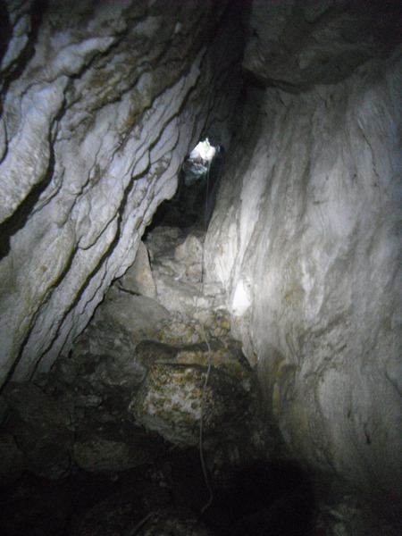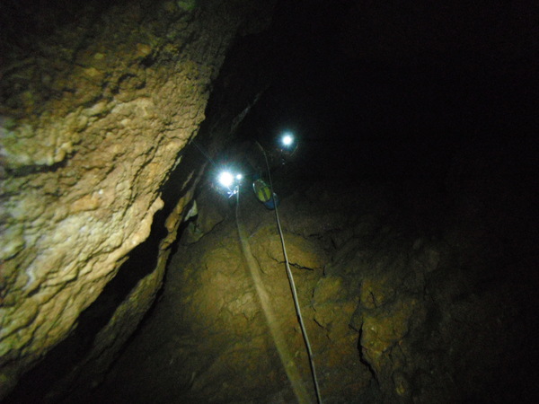 Alla base del primo pozzo c’e’ un altro scivolo di pochi metri e poi parte il terzo pozzo. Mentre Nonno Giorgio e Flavia sono impegnati a seguire i nostri apprendisti speleo ho un po’ di tempo a disposizione. Di materiale ce n’e’ in abbondanza, sul pozzo armo 2 vie cosi’ si potra’ scendere in contemporanea. Nel frattempo Adriano e Ivano si sono disimpegnati dal secondo pozzo e mi raggiungono. Sperimento la doppia via con loro. Scendo prima con Adriano, risalgo e ripeto la discesa con Ivano. Li lascio ben assicurati e con l’indicazione di non muoversi e torno indietro al secondo pozzo, Luana e’ scesa troppo con il discensore ed e’ un po’ in difficolta’. Tra Flavia e me riusciamo a darle le giuste indicazioni per sbloccarsi ed arrivare a meta. Porto anche lei alla doppia, scendiamo, e la lascio assicurata in compagnia dei suoi “colleghi”. Anche Claudio ha scelto la via difficile per passare il frazionamento. E sceso troppo, ma sembra riesca a districarsi. Anche lui alla fine arriva. Infine siamo tutti alla base del secondo pozzo. La prosecuzione non e’ intuitiva ma poi si rivela essere l’unica. Ci si infila in un angusto pertugio tra massi di crollo e si fa una curva a 90° trovandosi con i piedi a cercare appigli per scendere un saltino, tutto sommato e’ piu’ semplice di quanto sembra. Flavia, che si ricorda la grotta meglio di tutti, ispeziona il posto e spiega come si affrontano curva e saltino e quindi proseguiamo. Vado avanti per continuare con l’armo. C’e’ un pezzo di meandro, a meta’ si deve arrampicare un po’ perche’ sulla destra c’e’ una piccola voragine. In tutto saranno 10 metri di cammino. Si arriva ad una fessura verticale di circa 3 metri da affrontare alla egiziana, ma non e’ eccessivamente stretta. Dopo la strettoia ecco un altro pozzo. Mentre mi accingo ad armarlo arriva Flavia. Mi indica un attacco a mezza discesa che pensavo ci dovesse essere ma che non avevo ancora individuato. Scendendo lo utilizzo per mettere un deviatore, corto corto, cosi’ anche lui e’ ben scomodo! Alla base del pozzo e’ pieno di buchi e buchetti,